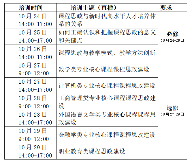 (10月24-26日三个主题为必修环节;10月27-29日六个主题为选修环节,参训教师至少参加一个主题学习,更多主题的学习不限。参训教师可于11月1-7日观看视频回放。)