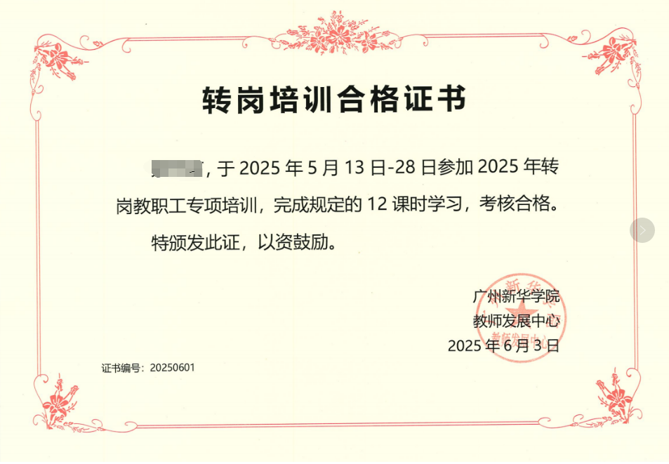 经过一段时间的紧张学习,所有参训人员均在规定时间内完成了规定的学时。其中,转为教师岗位的人员还按照要求提交了不少于1000字的学习心得。这些学习心得不仅记录了学员们在培训中的收获与感悟,更展现了他们对新岗位的热情与期待。最终,考核达标者由教师发展中心颁发了“转岗培训合格证书”,为本次培训画上了圆满的句号。